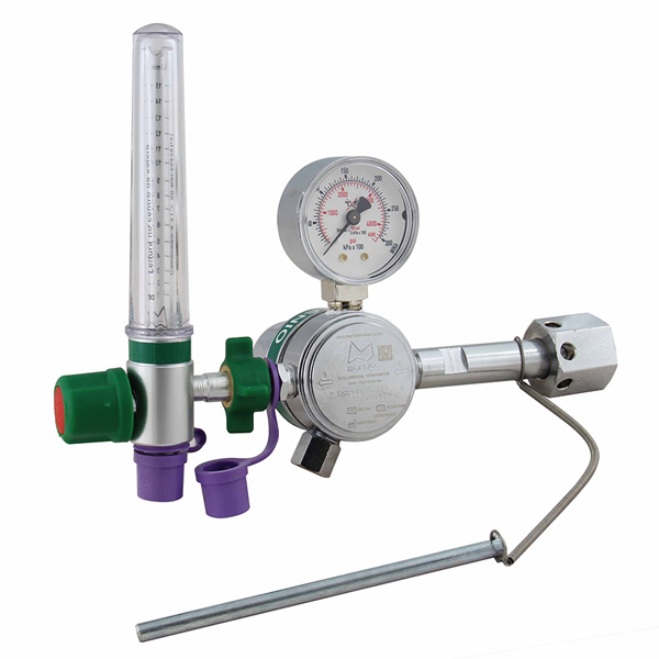 Os Reguladores de Pressão com Fluxômetro tem como função reduzir uma pressão de entrada, variável e alta, para uma pressão de saída baixa e constante, o fluxômetro controla e indica o fluxo dos gases. Há um Regulador de Pressão com Fluxômetro específico para cada tipo de gás.